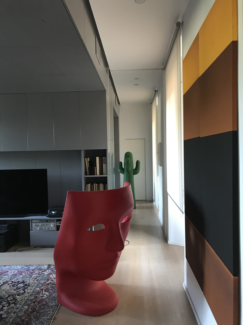 Scorcio con la poltrona Nemo di Fabio Novembre in primo piano e con il cactus Gufram di Guido Drocco e Franco Mello sullo sfondo