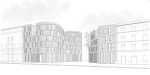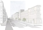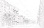 Una selezione di alcuni disegni dei progetti: prospettiva su via Labicana rigorosamente wireframe e pianta di progetto al piano terra.