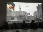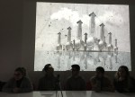 in una autorappresentazione gli studenti osservano il quadro di un “edificio mostro” composto da pezzi delle opere loro assegnate (stud. petricca, taji, tribolati)