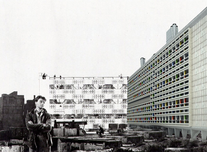 fotomontaggio di un edificio ibrido tra l’unitè d’habitation di le corbusier e il golden lane degli smithson (stud. di giorgio, ferrante, merlonghi, passariello)