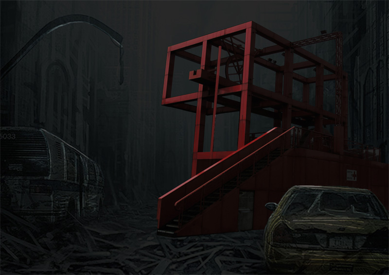 fotomontaggio in scenario apocalittico di una folie del parc de la villette di tschumi (stud. petricca, taji, tribolati)