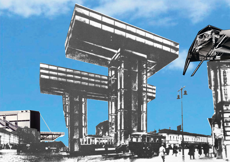 fotomontaggio 2 con paesaggio architettonico composto dalle tre opere assegnate (wolkebugel, petersschule, rooftop falkestrasse) (stud. amendola, botti, fefè)