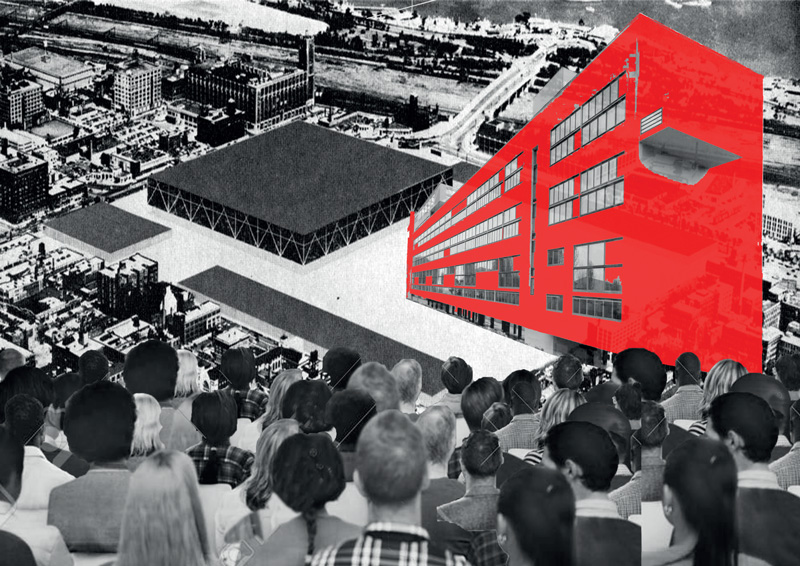 fotomontaggio visionario di spettatori che assistono all’incontro tra la convention hall di mies e il narkomfin di ginzburg (stud. filippi, murolo, ranieri, rossi)
