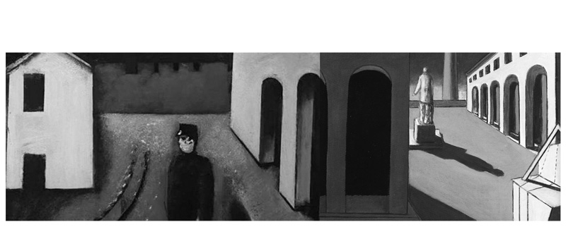 combinazione visiva tra un dipinto di Sironi (paesaggio urbano on ferrovie) e uno di De Chirico (enigma della partenza) (stud. morzetti, prinzi)