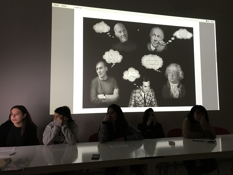 fotomontaggio degli architetti studiati mentre pensano a come usare il cerchio nei progetti assegnati (stud. alkaraguli, cascino milani, cobianchi, firmani, zhu)