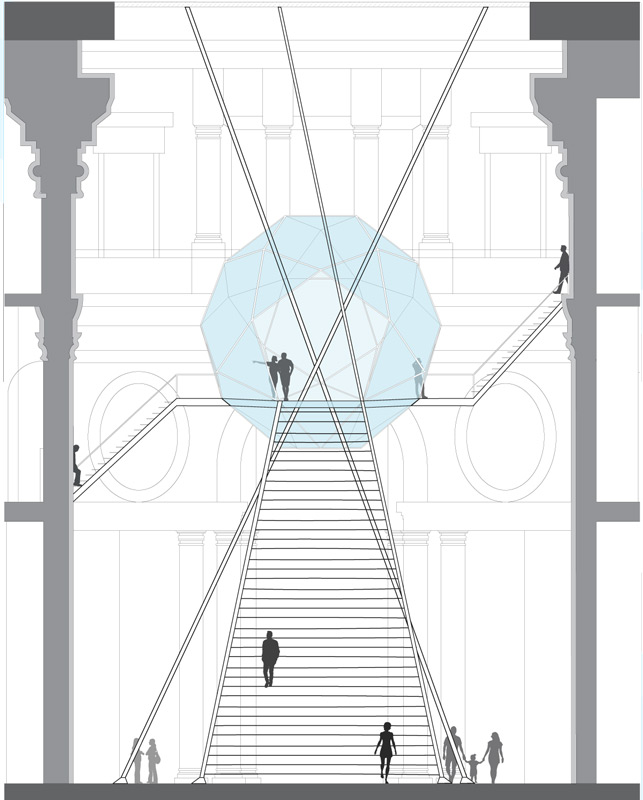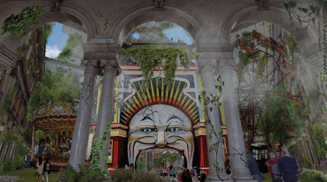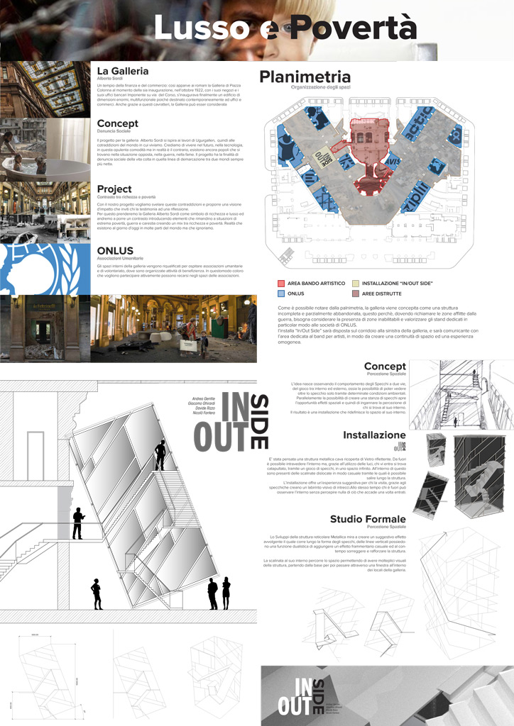 Invitando tutti i partecipanti del corso a riflettere su queste tematiche ho assegnato loro un tema di allestimento urbano all’interno della Galleria Alberto Sordi, in pieno centro di Roma (Piazza Colonna), luogo sede delle più importanti cariche politiche, baricentro del “parco commerciale” del tridente stradale del centro storico (Via del Corso, Via Ripetta, Via del Babuino), luogo di passaggio dei flussi del turismo di massa romano.