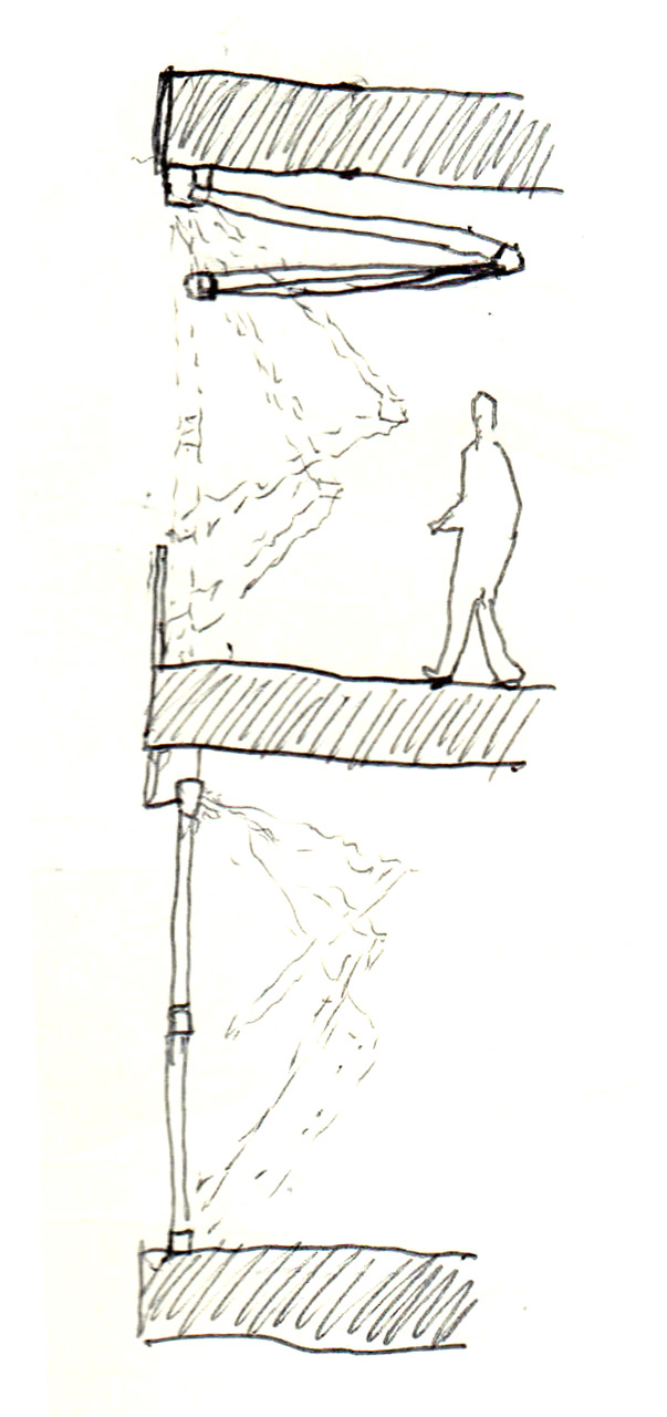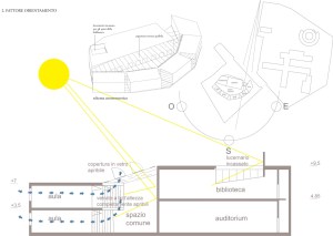 Anche per la biblioteca, situata al di sopra dello spazio dell’auditorium, è previsto un lucernario capace di fornire luce indiretta agli spazi dedicati.