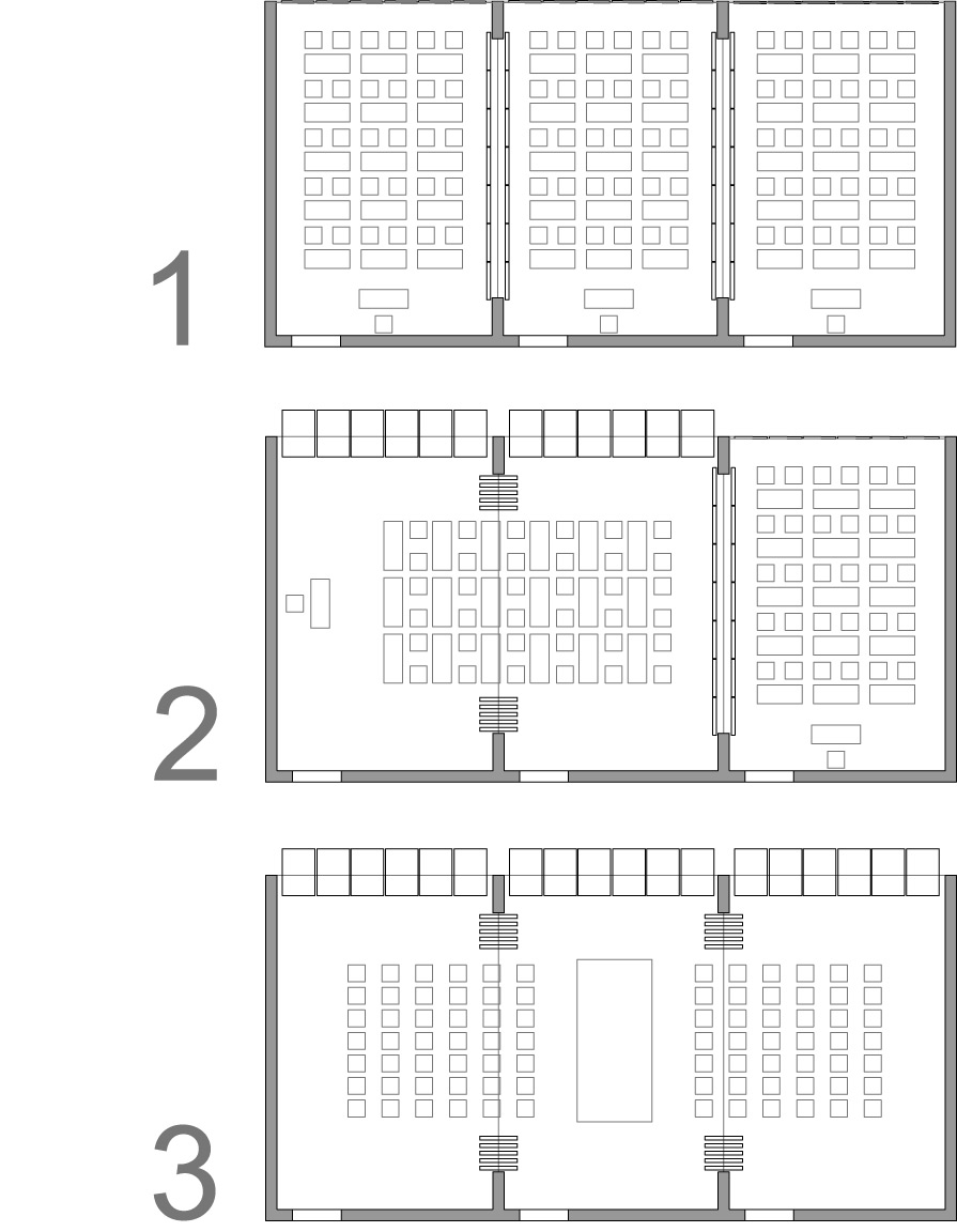 Le aule infatti sono dei rettangoli 6x9m (54mq) raggruppate a tre e separate da una pannellatura mobile che permette dunque l’aggregazione di uno o due moduli aula così da avere spazi più grandi (fino a 9x18m) a seconda delle necessità.