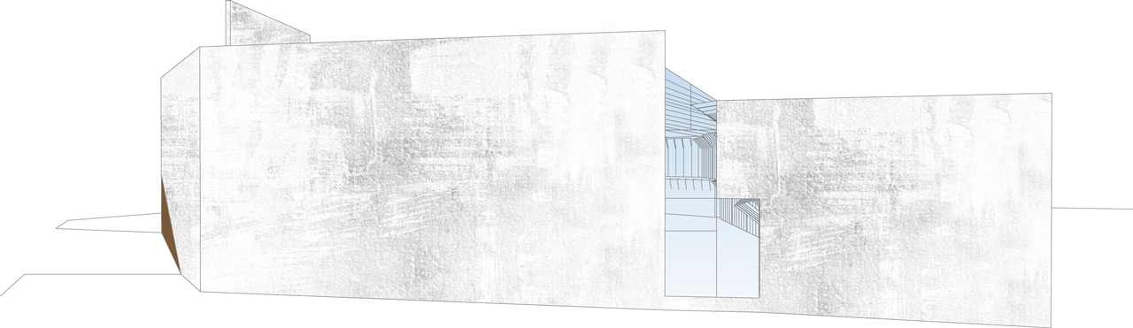 l’asse urbano percettivo primario è quello di via Rosina Ferrario Grugnola che determina l’ingresso ricavato in una spaccatura dell’edificio che si presenta come un monolite compatto.