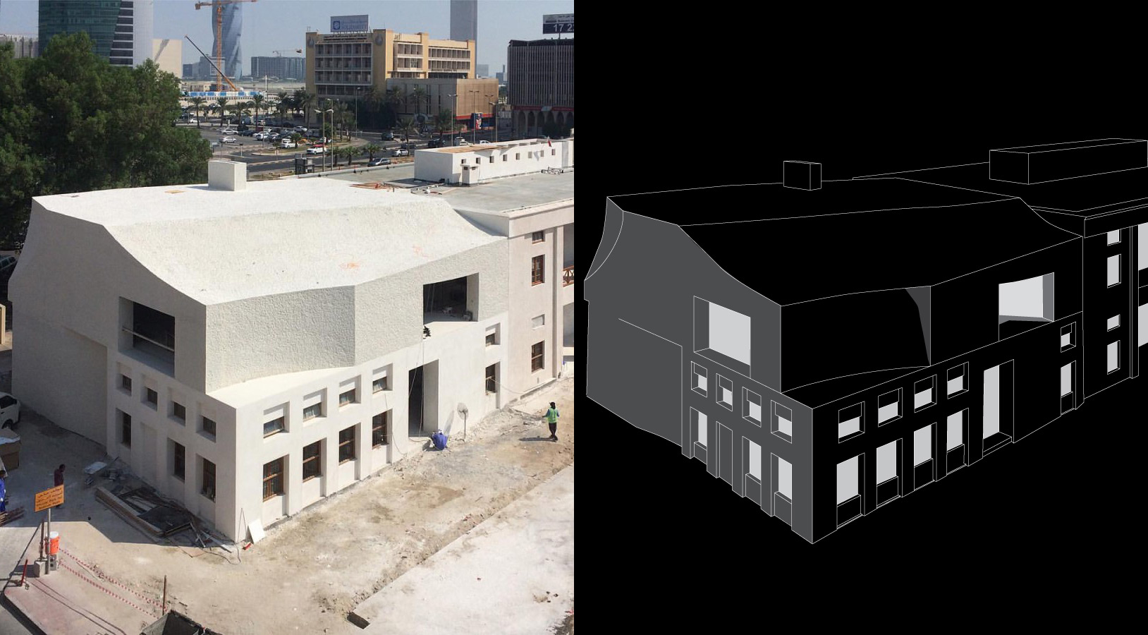 Qui ho ridisegnato l’ampliamento della Customs House, estensione del Post Office a Manama nel Bahrein, progettata dallo studio Anne Holtrop, 2019. Infatuato del volume massiccio e compatto dalle “forme meteoritiche” sovrapposte a un disegno di facciata regolare.