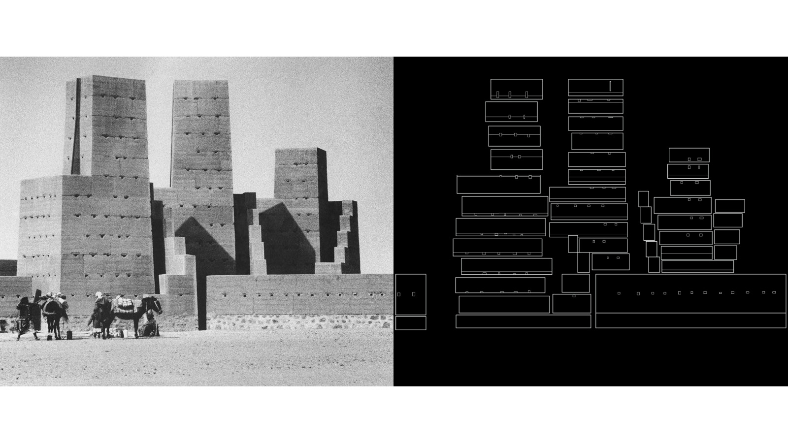 In questo secondo disegno di #savearchitecture #remakearchitecture (ridisegnare per reinventare), ho provato a ridisegnare su di una foto della Stadt des Orion, opera land art dell’artista Hannsjörg Voth, costruita tra il 1980 e il 2003 nella pianura di Marha in Marocco.Il ridisegno digitale a fil di ferro (wireframe) bianco su sfondo nero trasforma il suo aspetto, così materico, in una sorta di costruzione per elementi a fasce orizzontali segnate da forature piccole e puntuali, lineari, dando l’impressione di un paesaggio metropolitano molto denso e anche molto artificiale. Contrasti poetici tra fonte ed esito.