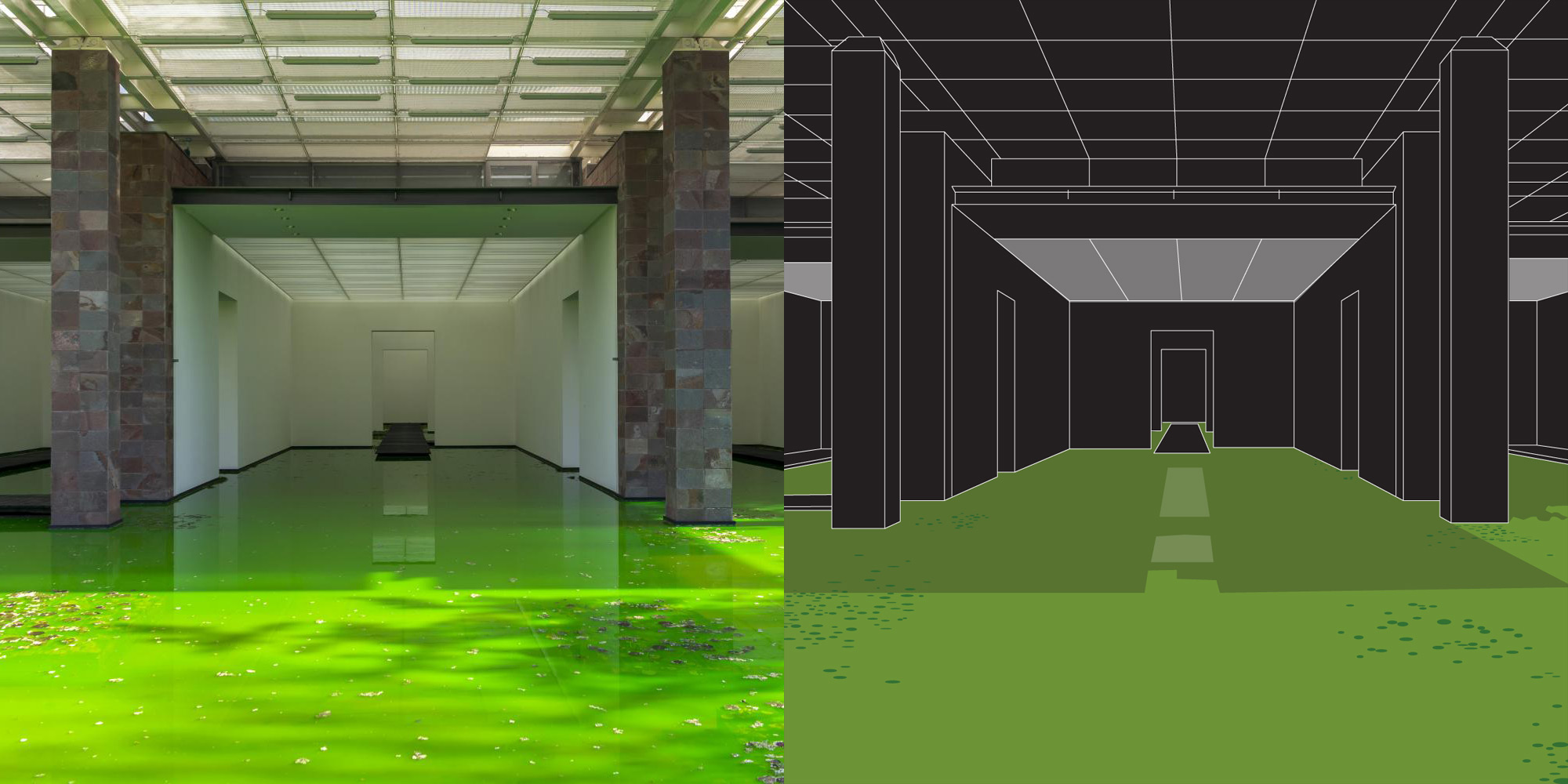 #savearchitecture ridisegno dell’installazione “Life” di Olafur Eliasson realizzata quest’anno alla Fondazione Beyeler di Riehen (Basel). L’allagamento dello spazio espositivio mi sorprende e mi convince dell’importanza di ripensare il suolo come elemento architettonico, anche nelle preesistenze, per permettere una maggiore integrazione con la natura.