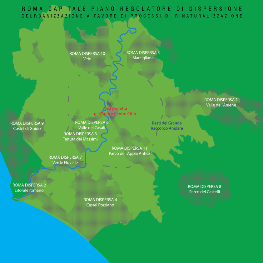 Qui si immagina una prefigurazione della città di Roma per un “Piano di Dispersione” in cui l’abitato si sposta nelle grandi aree verdi che dalla città si aprono verso il territorio extra urbano nonché lungo il litorale sul mare.