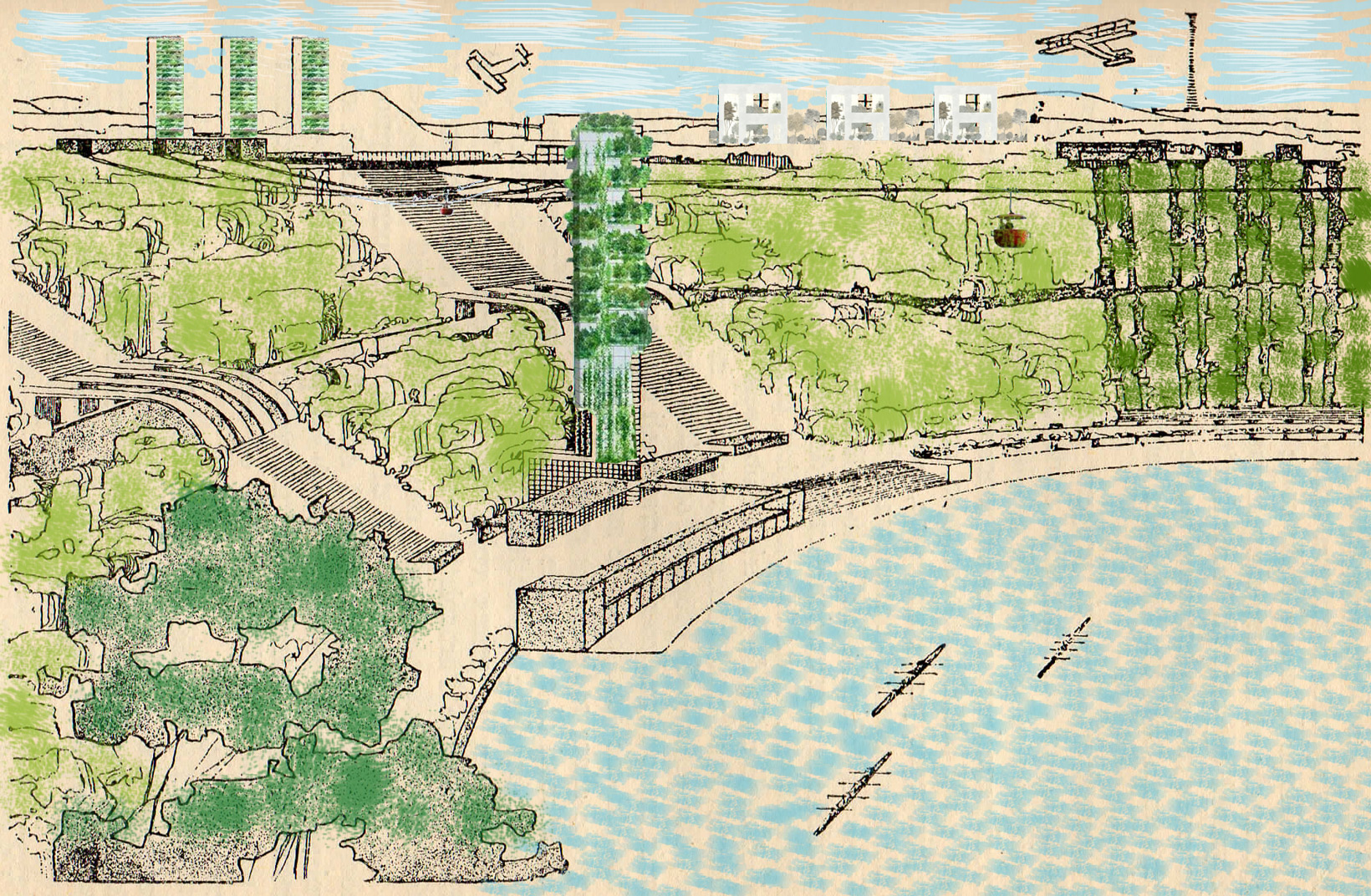 Qui un primo disegno (collage digitale) di nuovi tentativi di sistemi insediativi basati su tentativi di costruzioni integrate nel sistema del verde come le sperimentazioni dei “boschi verticali” dello studio Boeri o la “house for plants” di Junya Ishigami (la base del collage è il disegno di “parco continuo” nella “città verde” di Mosca, 1929, da “Città e Rivoluzione” di Anatole Kopp, Feltrinelli, Milano, 1972).