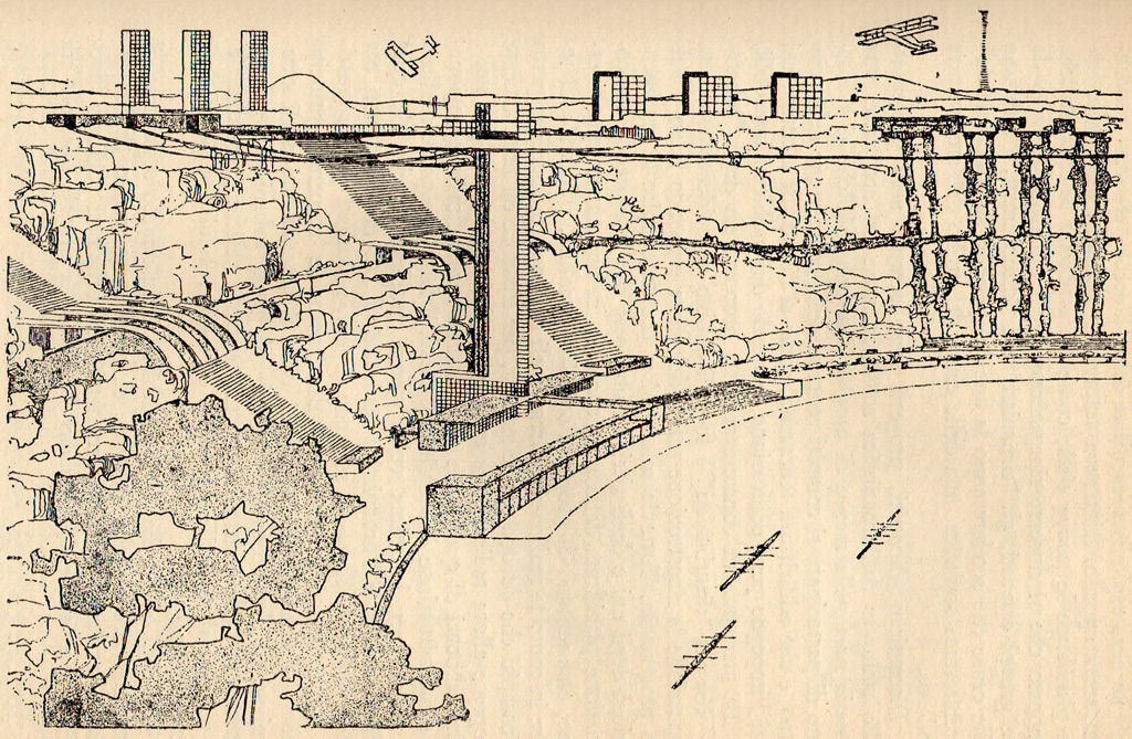 1) senza più un centro, il centro è solo un riferimento geometrico intorno alla quale la città diffusa si organizza (rif. Concorso “Città Verde” di Mosca, 1929)