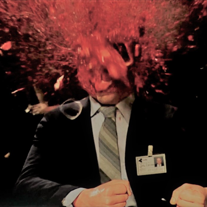 La cosa incredibile è che lo stavano guardando in tanti, tantissimi. Oltre alla platea, l’intervento era trasmesso su moltissime piattaforme televisive. Finalmente Hans Blü, dopo i tanti anni di attivismo, che parla nella sua veste di segretario generale dell’UE. Da una parte i tanti sostenitori, dall’altra la curiosità di molti, e in ultima istanza l’attenzione dei suoi detrattori, la diretta era seguita da moltissimi. Ebbene successe quello che è successo. Nel mentre del suo speech si notarono giusto alcuni movimenti fuori dal normale della testa ed alcune espressioni un po’ forzate (uno strano e innaturale sorriso pendente verso un solo angolo della bocca, un rigonfiamento delle vene del collo e quell’esitazione nel completare le parole). Ma poi incredibilmente l’esplosione. Così di punto in bianco in piena diretta. L’esplosione della testa. Con quel nuvolo di sangue e brandelli di cervello ed ossa che schizzarono in aria.