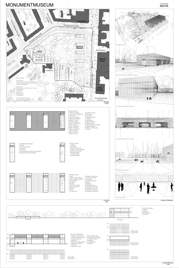 The museum refers particularly to the park more than the city. The main facade overlooks the garden and not the fronts of the streets buildings, so as to bring the access museum’s flows inside the park. On the ground floor of the building is reduced to 4 blocks to allow the horizontal cross of the park area. The whole project area has been redesigned in order to be a great urban space paved, pertaining to the museum, in total contrast with the current design of the park.