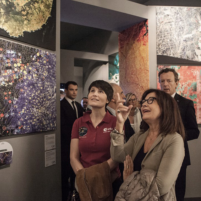 astronaut samantha crisotoforetti visits the exhibit with viviana panaccia (the curator) and the ASI president roberto battiston